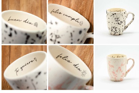 Taza de cerámica artesanal decorada con calco vitrificable.